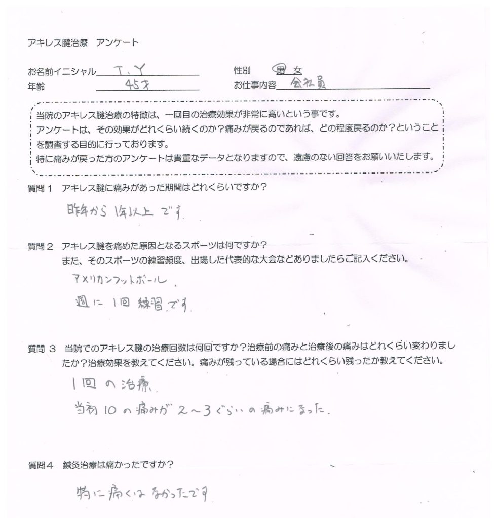 1回目の治療でみなさん痛みが半減以上しておりますので、アキレス腱に痛みがある方は是非この不思議な治療効果を体験してみてください。
