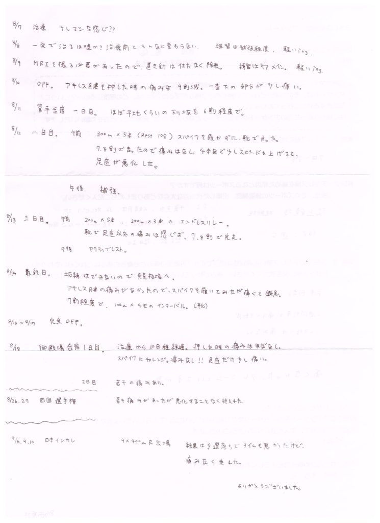 陸上部の合宿の直前のご来院で、「痛みがぶり返さないといいな…。」と思っていたのですが、ほぼ痛みは取れているらしく、安心しました。