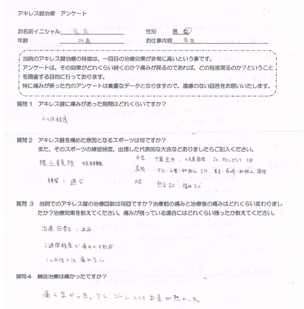 アンケート用紙の裏にまで詳細な治療後の痛みの変化をご記入いただきました。このような細かい痛みの推移は私もとても勉強になります。ありがとうございました。