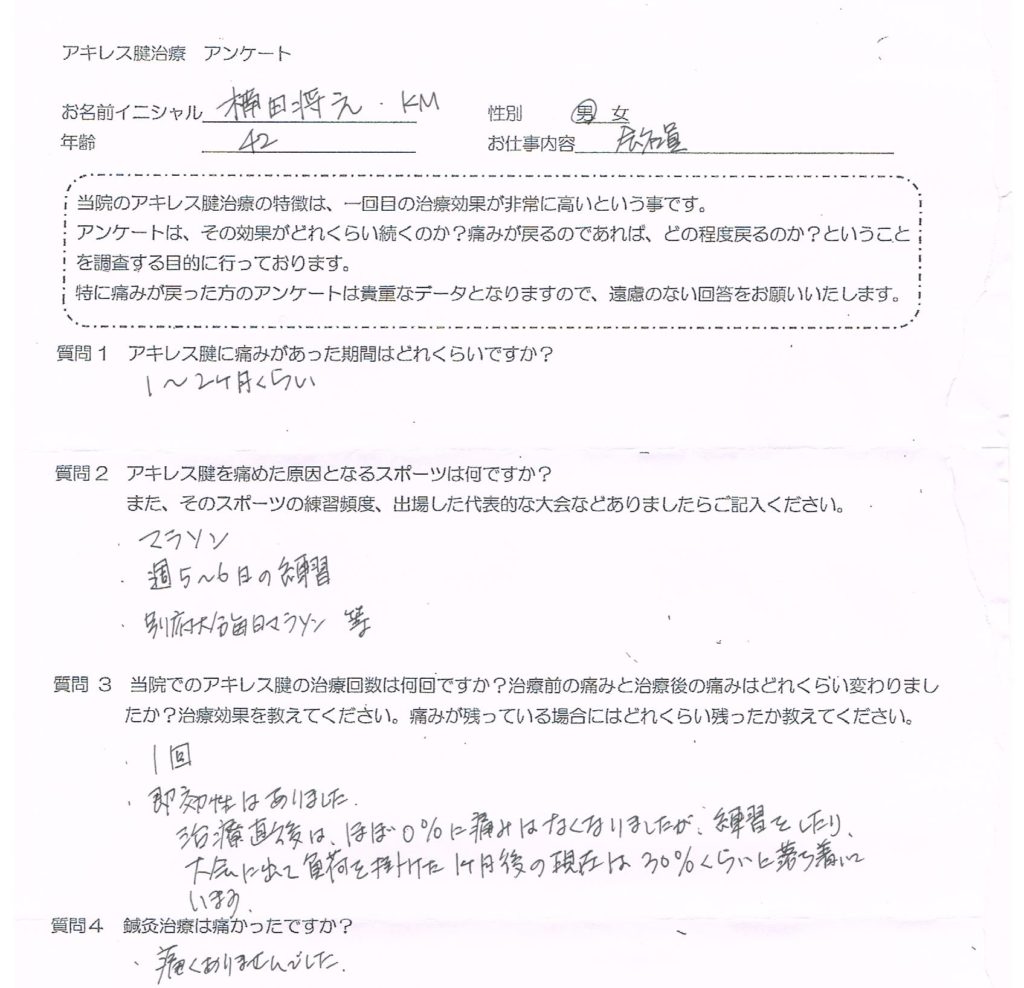また、普通のスポーツ鍼灸といわれるような部類とも全く違う、東洋医学によるアキレス腱治療です。