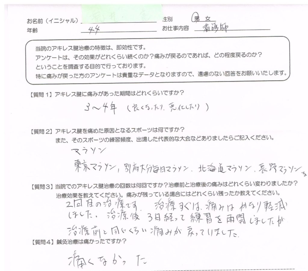 「せっかく治療直後は痛みが減っていてもフルマラソンを走ったら痛みがぶり返す可能性がありますよ」と説明をして治療は終わりました。