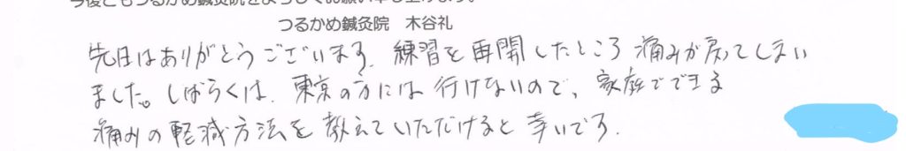 治療後3日経って練習を再開しましたが治療前と同じくらい痛みが戻ってしまいました。