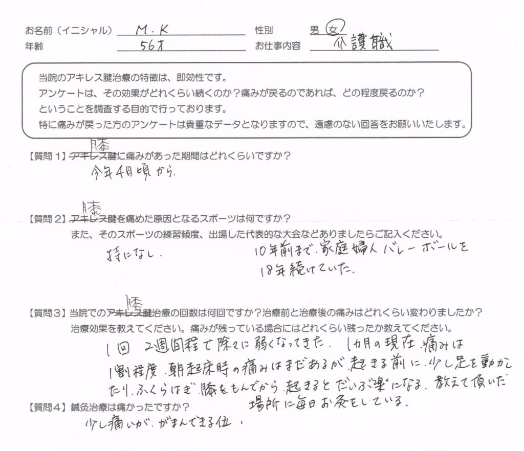 一年半ほど前にアキレス腱炎で伺い一度だけ治療していただきましたが、その後短い期間で忘れたように痛みがなくなり現在に至っております。ありがとうございました。