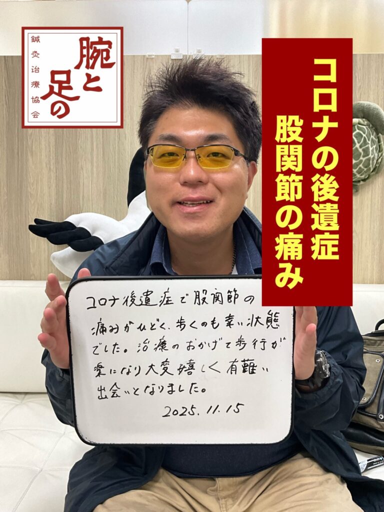 普段、スポーツによる痛みの治療の多いつるかめ鍼灸院ですが、今回はコロナの後遺症による股関節の痛みに悩まれていた患者様にも劇的な効果が得られた症例を紹介いたします。